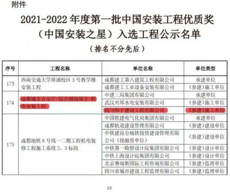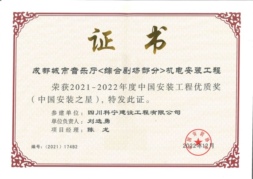 四川科宁建设工程有限公司参建的成都城市音乐厅(综合剧场部分)机电安装工程荣获中国安装工程优质奖(中国安装之星)
