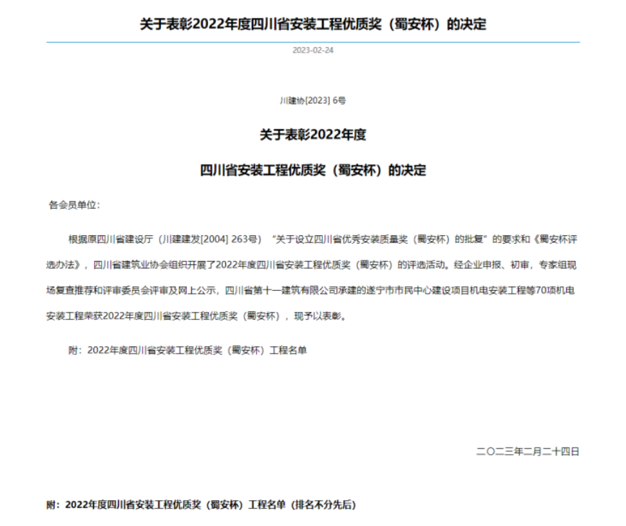 四川省安装工程优质奖(蜀安杯)系四川地区官方认可的***高奖项。公司申报的项目获得这份荣誉来之不易,是多年来四川科宁家人们辛勤耕耘的收获,这份荣誉也将成为引领我们向新的高度迈进的动力。未来,我们将一如既往,秉持初心,奋发有为,将质量理念贯彻到每一个项目中,用质量对话客户,用匠心铸就精品!